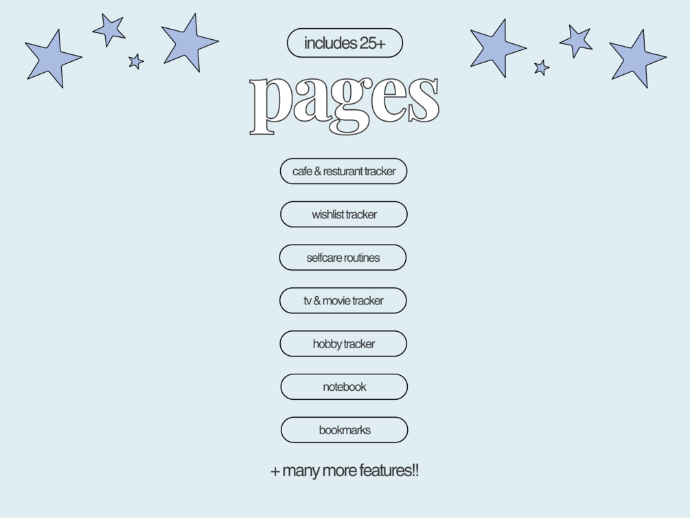 This template comes with so many different trackers to help you organise your life and hobbies. It includes plenty of trackers including a wish list, skincare, hobby, tv and movie, cafe and restaurant tracker and also a travel planner to plan and organise your future holidays.