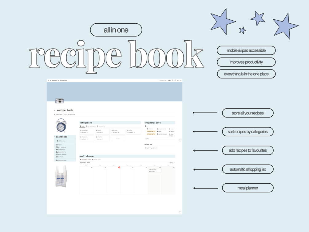 Welcome to your recipe book and meal planner with this easy to use Notion Template!! Manage all of your recipes and keep on top of organisation with this template’s in built meal planner.
