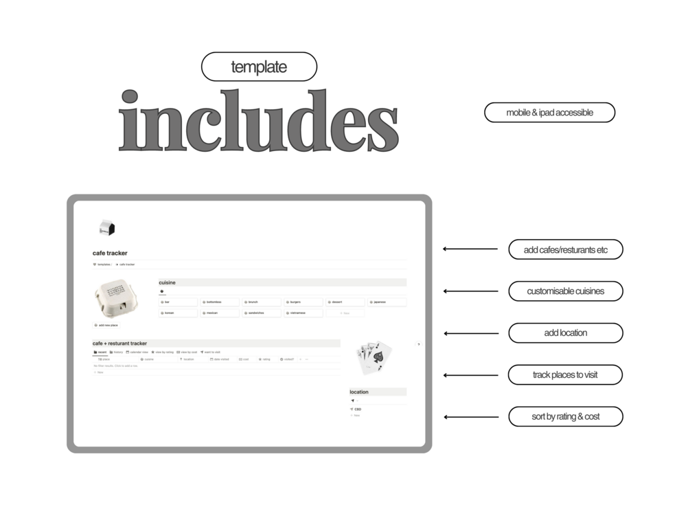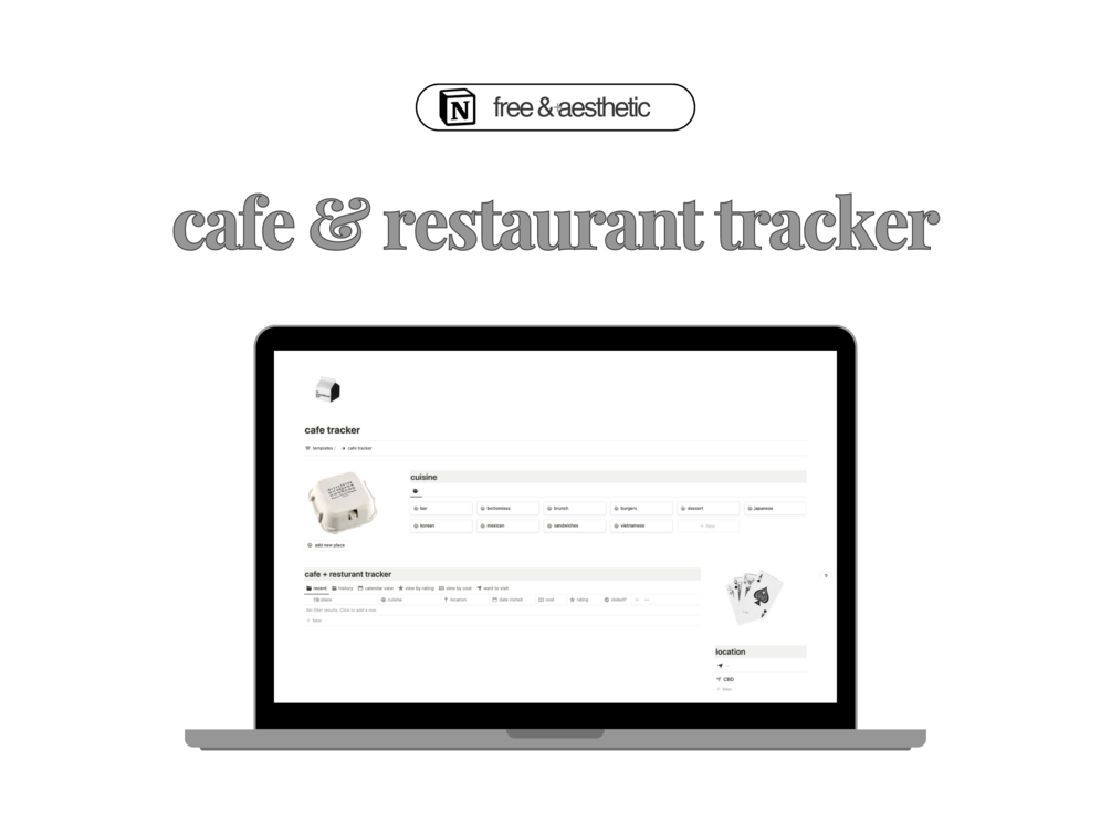 Savour all your favourite food places with this notion template! Track all the cafe's, restaurants, bars, or whatever food place really all within this template. I wanted to make a simple template which shows me all the cuisines I've been to as well as their location so I can look back if I'm ever in a pickle deciding where to eat. Which is why I've made this free cafe and restaurant tracker!