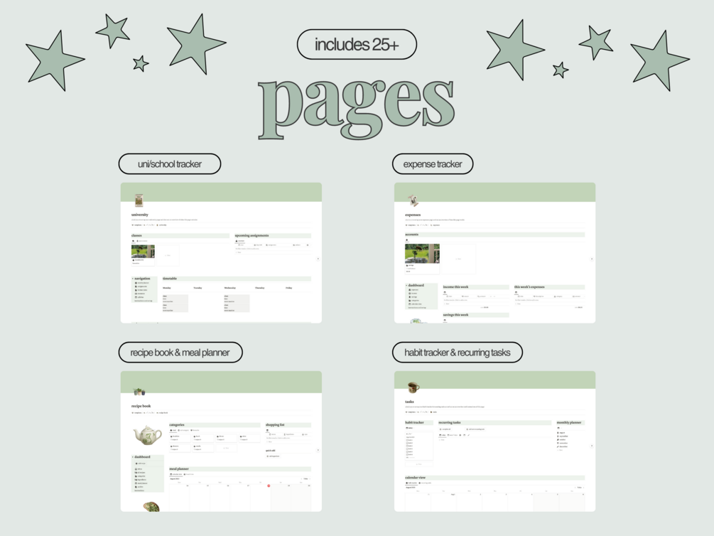 This planner will help you keep track of all your tasks, meal plans, education, habits, recurring tasks, expenses and so many more aspects in a streamlined manner. This planner is also extremely customisable so you can cater to all your needs, making organisation and planning easier than ever!