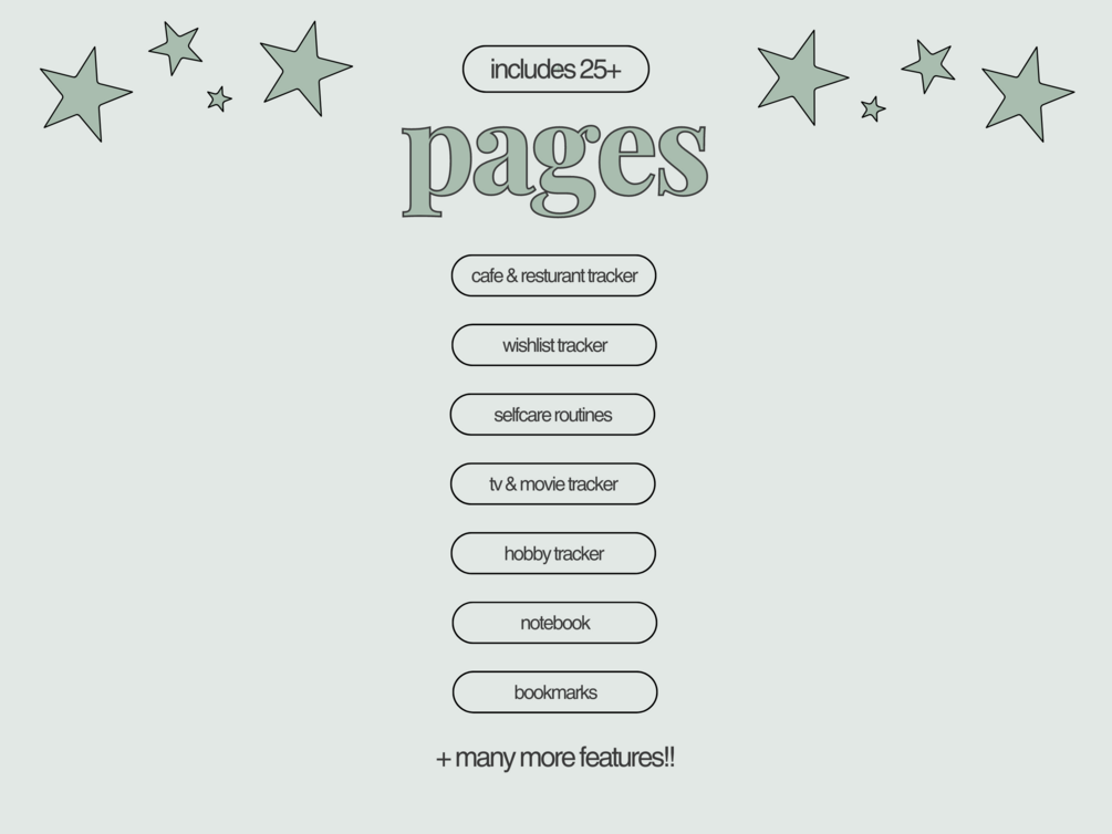 This template comes with so many different trackers to help you organise your life and hobbies. It includes plenty of trackers including a wish list, skincare, hobby, tv and movie, cafe and restaurant tracker and also a travel planner to plan and organise your future holidays.