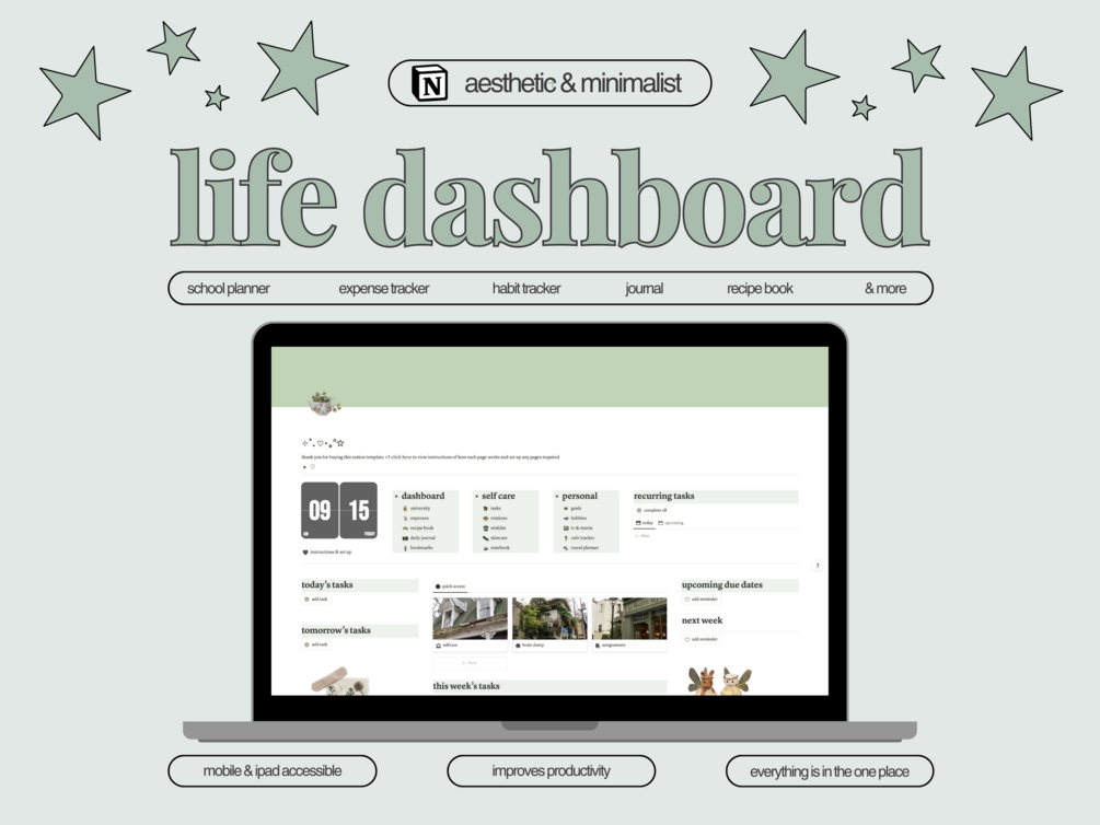 Welcome to your ultimate life dashboard with this easy to use Notion Template!! Improve your productivity and never forget anything ever again by having a central place to organise your life!