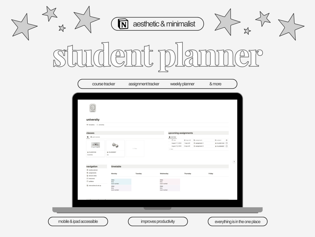 Welcome to your new student planner. Organise your new term or semester with this easy to use Notion Template!! Keep on top of organisation and never miss a deadline again.